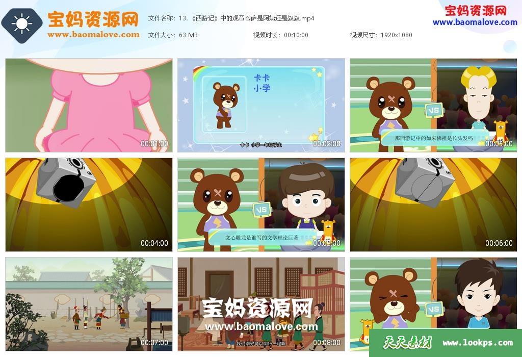 天天资源网收录的动画片《水木名著之旅》,全部270集,国语发音,中文字幕;资源总大小约18.7G,单集播放时长约10分钟,1080P高清MP4视频格式,可以在电视机或电脑、平板、IPAD、早教机、手机等各种设备播放,提供百度云网盘下载。