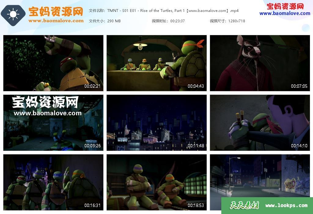 天天资源网收录的动画片《Teenage Mutant Ninja Turtles》忍者神龟英文版 第一季,全部26集,英语发音,外挂英文字幕;资源总大小7.07G,单集播放时长约23分钟,720P高清MP4视频格式,可以在电视机或电脑、平板、IPAD、早教机、手机等各种设备播放,提供百度云网盘下载。
