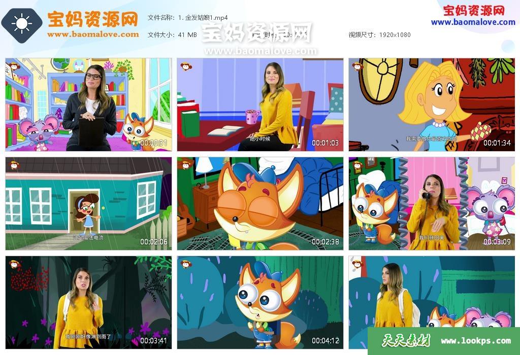 天天资源网收录的动画片《走进童话王国》My Booksy中文版,全部26集,国语发音,中文字幕;资源总大小约1.11G,单集播放时长约5分钟,1080P高清MP4视频格式,可以在智能电视机或电脑、平板、IPAD、早教机、手机等各种智能设备播放,提供百度云网盘下载。