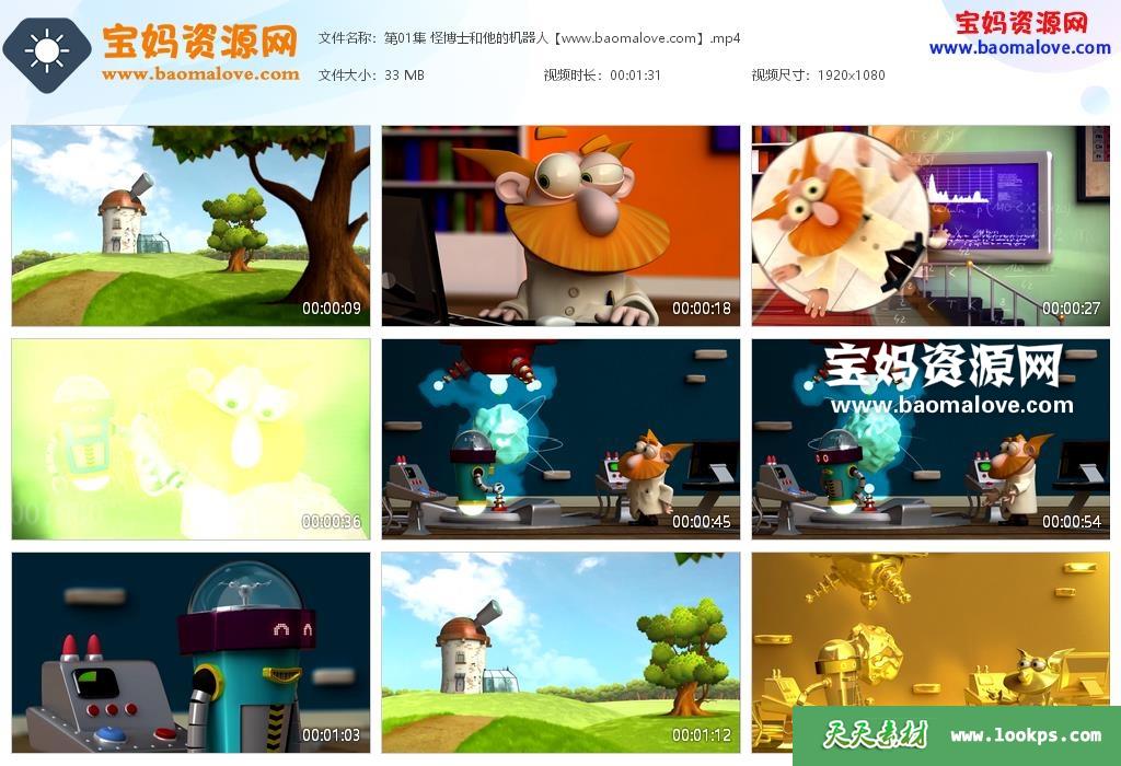 天天资源网收录的动画片《怪博士和他的机器人》Labo Genius中文版,全部35集,国语发音,无字幕;资源总大小约1.15G,单集播放时长约1分钟,1080P高清MP4视频格式,可以在智能电视机或电脑、平板、IPAD、早教机、手机等各种智能设备播放,提供百度云网盘下载。