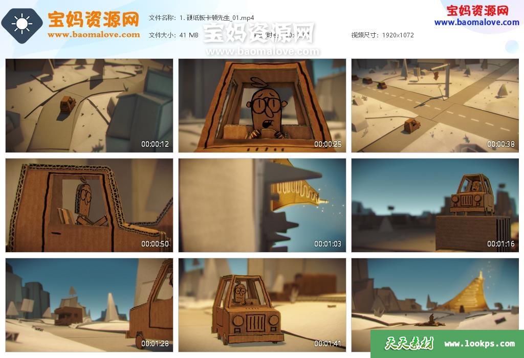 天天资源网收录的动画片《硬纸板卡顿先生 Mr Carton》,全部13集,默片无对白,无字幕;资源总大小约385M,单集播放时长约2分钟,1080P高清MP4视频格式,可以在电视机或电脑、平板、IPAD、早教机、手机等各种设备播放,提供百度云网盘下载。