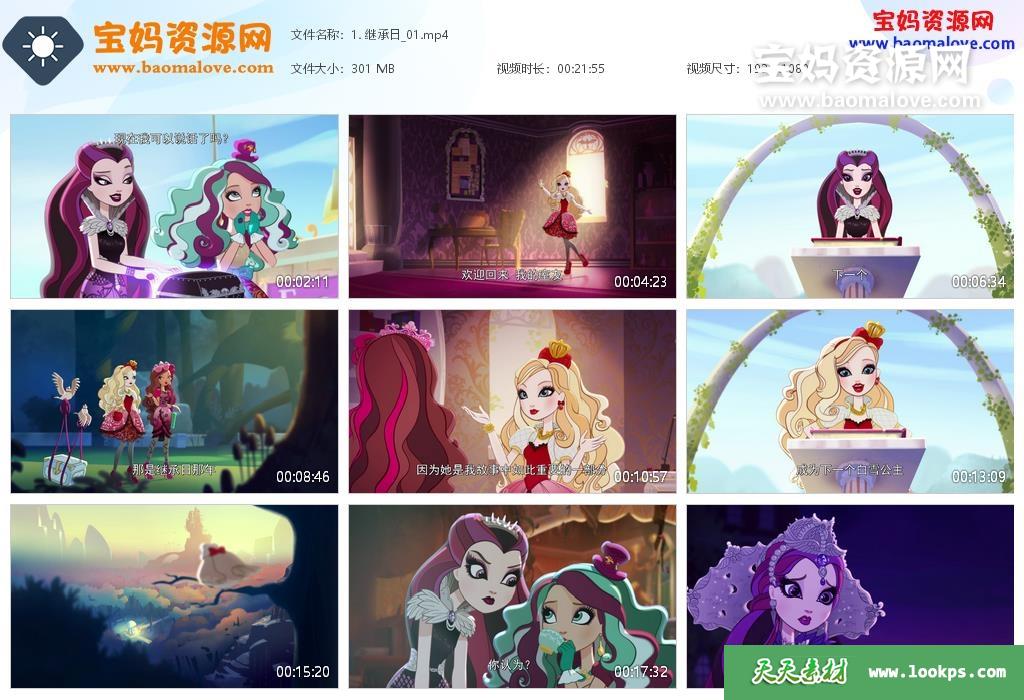 天天资源网收录的动画片《Ever After High》童话高中英文版,全部77集,英语发音,中文字幕;资源总大小9.04G,单集播放时长约22分钟,1080P高清MP4视频格式,可以在电视机或电脑、平板、IPAD、早教机、手机等各种设备播放,提供百度云网盘下载。