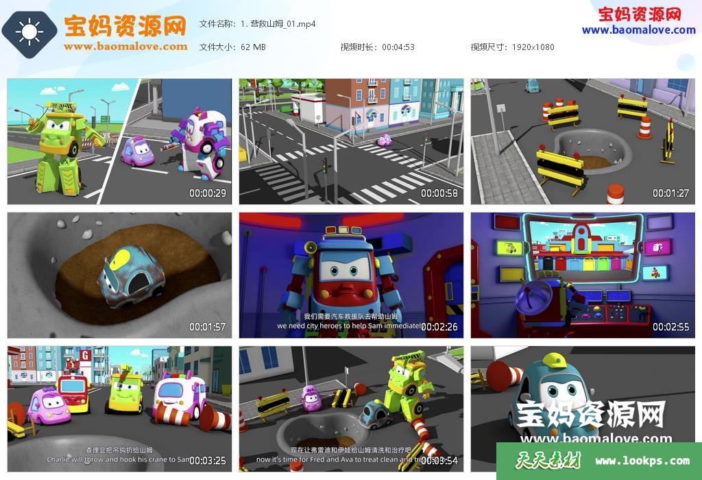 天天资源网收录的动画片《汽车救援队》英文版,全部39集,英语发音,中英文字幕;资源总大小2.41G,单集播放时长约4~5分钟,1080P高清MP4视频格式,可以在电视机或电脑、平板、IPAD、早教机、手机等各种设备播放,提供百度云网盘下载。