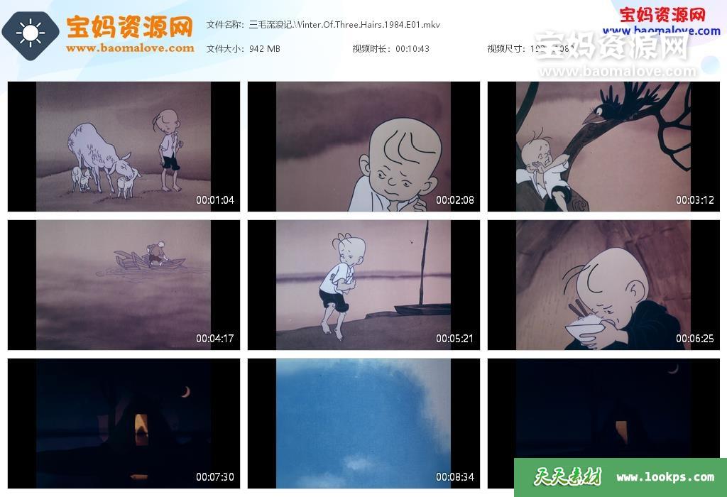 天天资源网收录的动画片《三毛流浪记》高清修复版,全部4集,默片无对白,无字幕;资源总大小3.5G,单集播放时长约10分钟,1080P高清MKV视频格式,可以在电视机或电脑、平板、IPAD、早教机、手机等各种设备播放,提供百度云网盘下载。