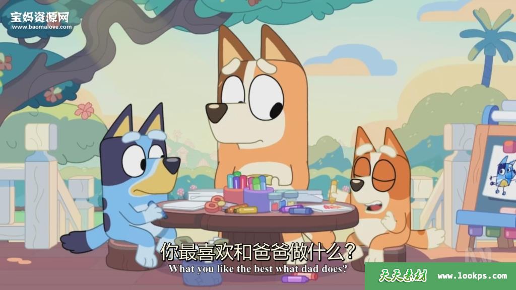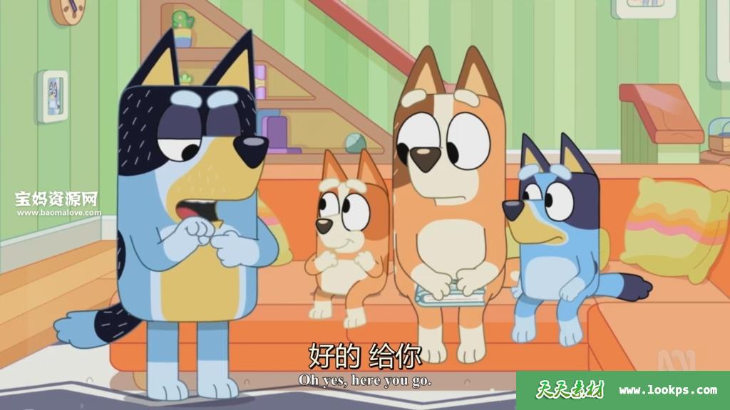 动画片主人公是“一家四狗”,爸爸Bandit,妈妈Chilli,以及姐姐Bluey和妹妹Bingo,妈妈在外工作,爸爸在家带娃。故事全部是日常生活,从中可以学到不少亲子游戏。