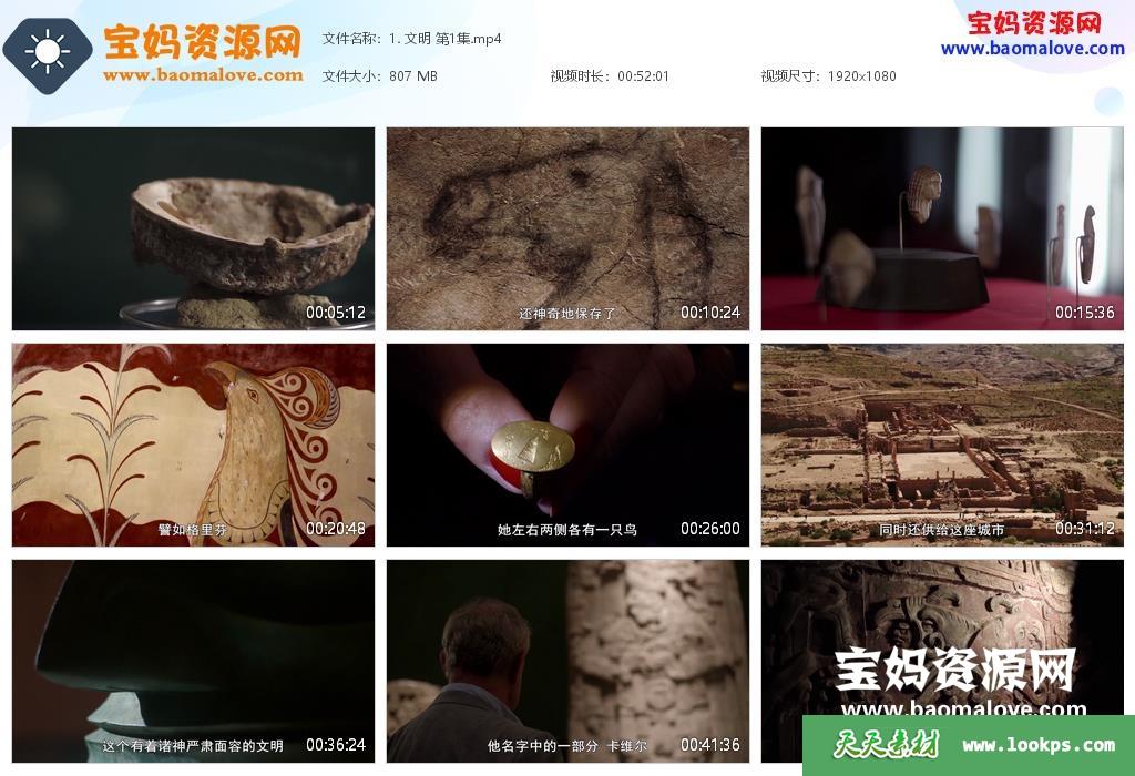 天天资源网收录的纪录片《文明 Civilisations》,全部9集,英语发音,中文字幕;资源总大小约5.64G,单集播放时长约52分钟,1080P高清MP4视频格式,可以在电视机或电脑、平板、IPAD、早教机、手机等各种设备播放,提供百度云网盘下载。