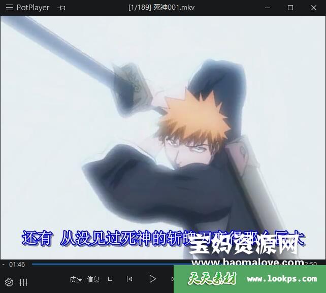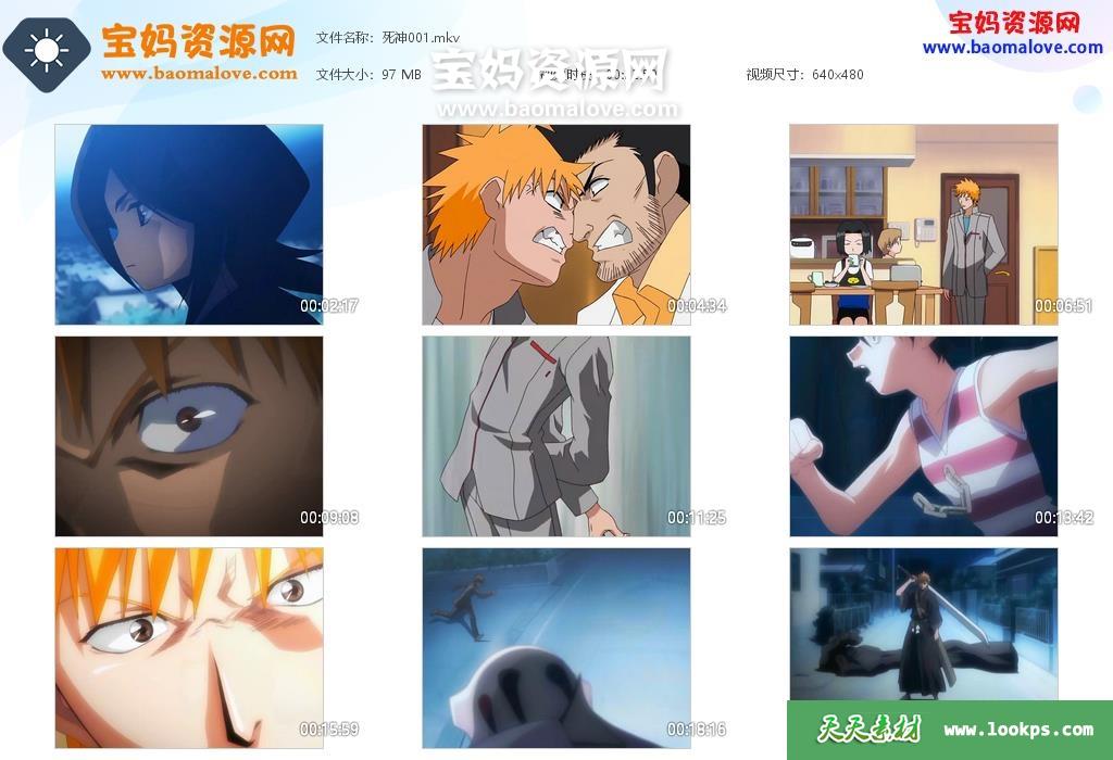 天天资源网收录的动画片《死神 bleach》第一季,全部189集,台配国语/日语发音,内置中文字幕(可以下载后使用播放器选择字幕或者关闭字幕);资源总大小约19G,单集播放时长约23分钟,480P标清MKV视频格式,可以在电视机或电脑、平板、IPAD、早教机、手机等各种智能设备播放,提供百度云网盘下载。