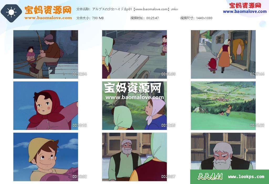 天天资源网收录的动画片《阿尔卑斯山的少女海蒂》,全部52集,新台配国语/老台配国语/粤语/日语发音,内置简体中文、繁体中文字幕、日文字幕(可以下载后使用播放器选择设置字幕或者关闭字幕);资源总大小约36.4G,单集播放时长约26分钟,1080P高清MKV视频格式,可以在电视机或电脑、平板、IPAD、早教机、手机等各种智能设备播放,提供百度云网盘下载。