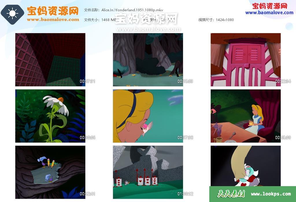 天天资源网收录的动画电影《爱丽丝梦游仙境 Alice in Wonderland》,英语发音,内置英文字幕(可以下载后使用播放器设置字幕字体大小颜色或者切换关闭字幕);资源大小约1.43G,1080P高清MKV视频格式,可以在电视机或电脑、平板、IPAD、早教机、手机等各种设备播放,提供百度云网盘下载。
