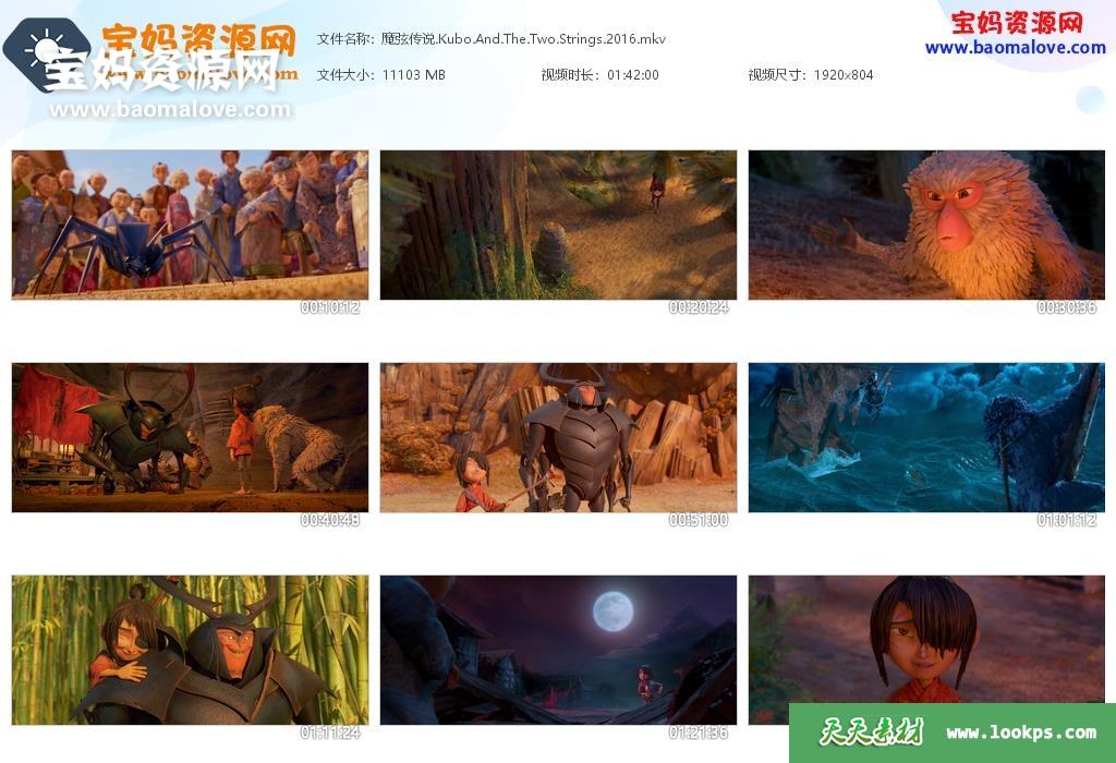 天天资源网收录的动画电影《魔弦传说 Kubo and the Two Strings》,国英双语发音,内置中英文字幕(可以下载后使用播放器选择设置字幕或者关闭字幕);资源大小约10.8G,804P高清MKV视频格式,可以在电视机或电脑、平板、IPAD、早教机、手机等各种设备播放,提供百度云网盘下载。
