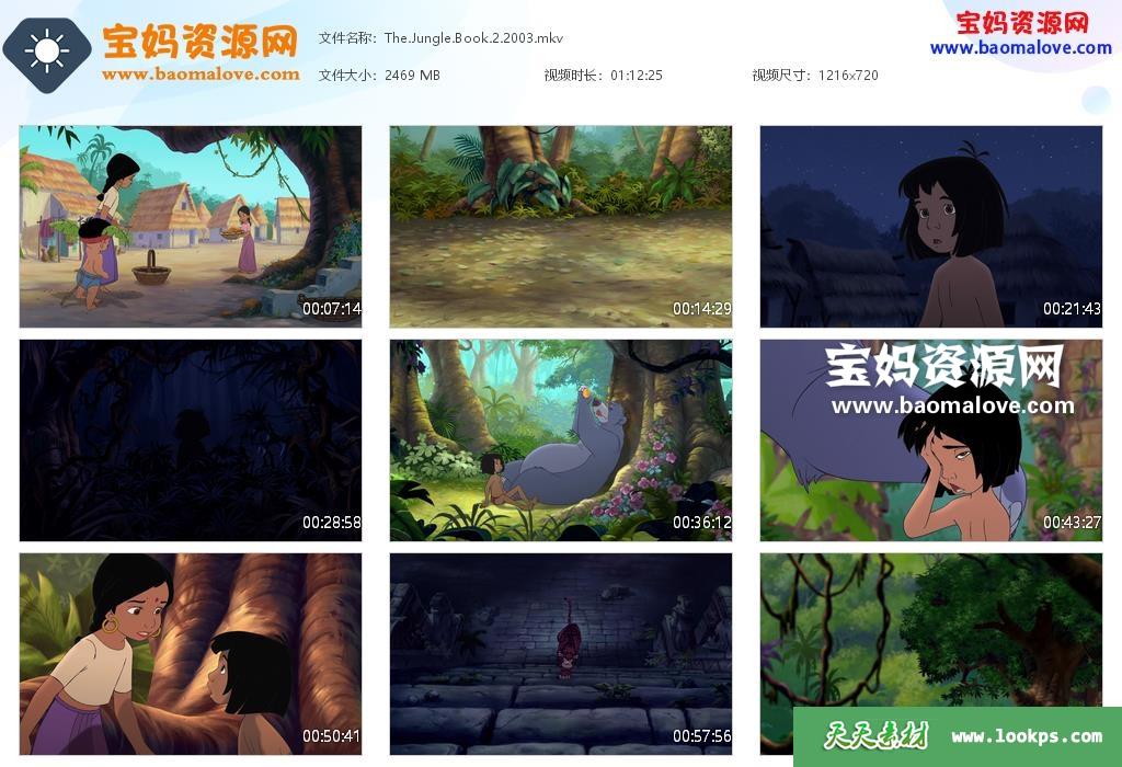 天天资源网收录的动画电影《森林王子2 The Jungle Book 2》,国粤英三语发音,内置中英文字幕(可以下载后使用播放器选择设置字幕或者关闭字幕);资源大小约2.41G,720P高清MKV视频格式,可以在电视机或电脑、平板、IPAD、早教机、手机等各种设备播放,提供百度云网盘下载。
