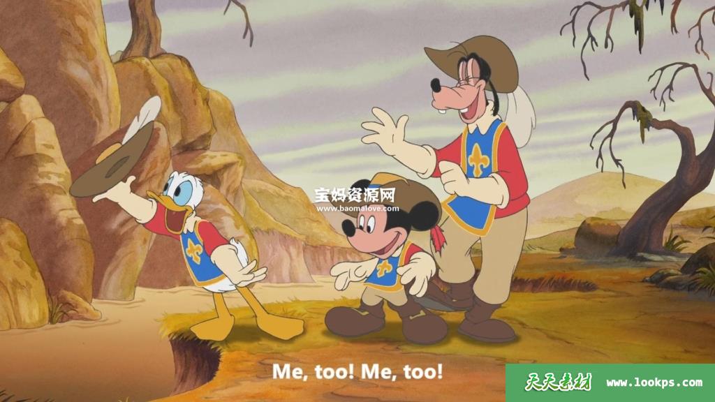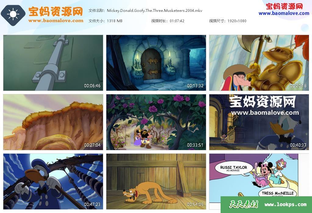 天天资源网收录的动画电影《三个火枪手 Mickey, Donald, Goofy: The Three Musketeers》,英语发音,内置英文字幕(可以下载后使用播放器设置字幕字体大小颜色或者切换关闭字幕);资源大小约1.28G,1080P高清MKV视频格式,可以在电视机或电脑、平板、IPAD、早教机、手机等各种智能设备播放,提供百度云网盘下载。