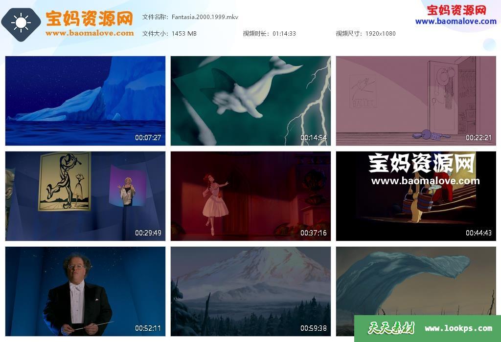 天天资源网收录的动画电影《幻想曲2000 Fantasia 2000》,英语发音,内置英文字幕(可以下载后使用播放器设置字幕字体大小颜色或者切换关闭字幕);资源大小约1.41G,1080P高清MKV视频格式,可以在电视机或电脑、平板、IPAD、早教机、手机等各种智能设备播放,提供百度云网盘下载。