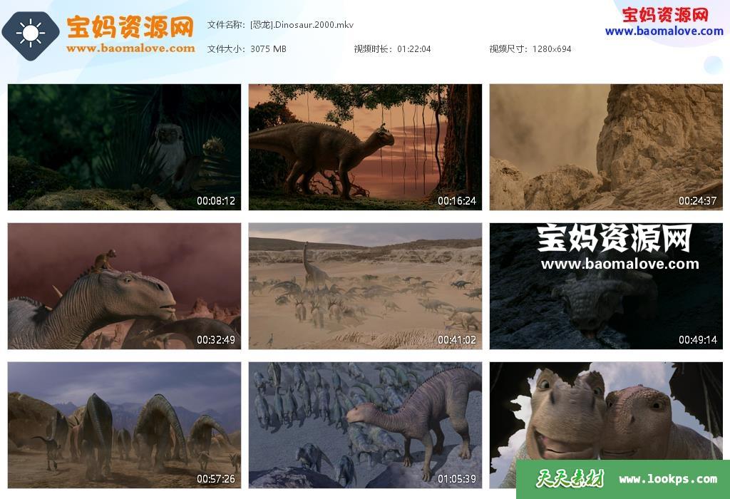 天天资源网收录的动画电影《恐龙 Dinosaur》,台粤英三语发音,内置中英文字幕(可以下载后使用播放器选择设置字幕或者关闭字幕);资源大小约3G,720P高清MKV视频格式,可以在电视机或电脑、平板、IPAD、早教机、手机等各种智能设备播放,提供百度云网盘下载。