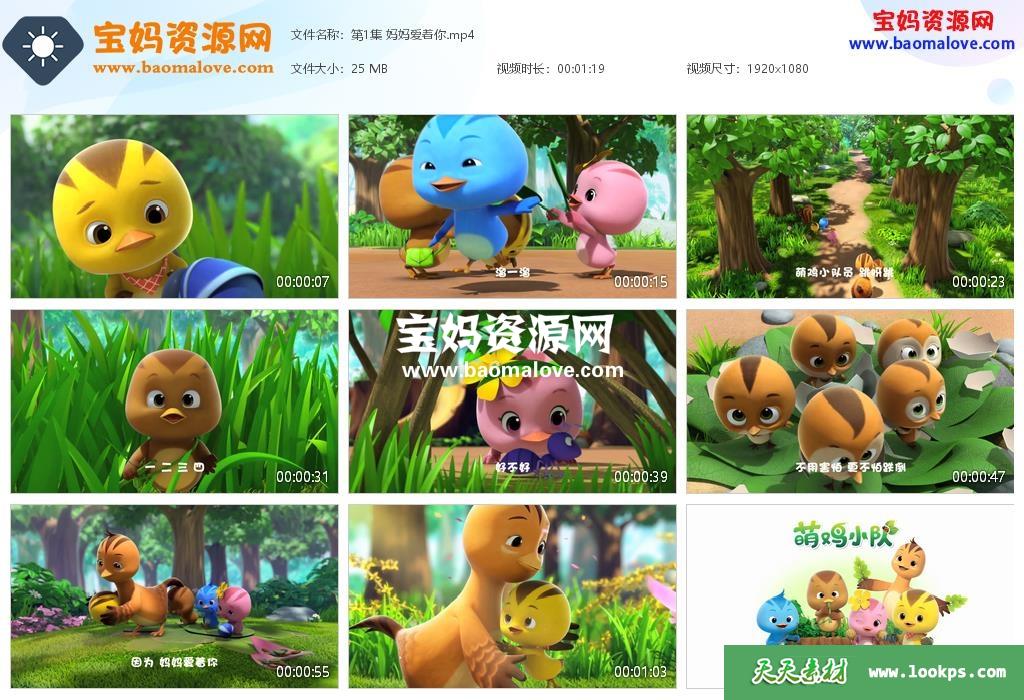 天天资源网收录的动画片《萌鸡小队趣儿歌》,全部91集,国语发音,中文字幕;资源总大小1.57G,单集播放时长约1~2分钟,1080P高清MP4视频格式,可以在电视机或电脑、平板、IPAD、早教机、手机等各种智能设备播放,提供百度云网盘下载。
