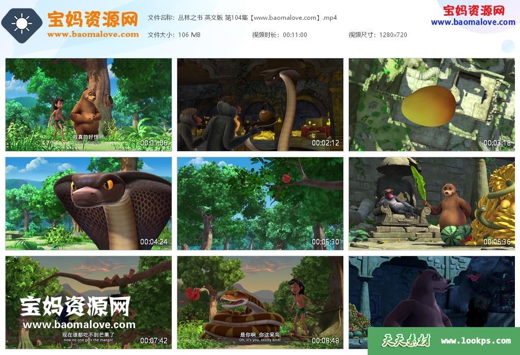 天天资源网收录的动画片《The Jungle Book》丛林之书英文版,全部104集,英语发音,中英文字幕;资源总大小约11.6G,单集播放时长约11分钟,720P高清MP4视频格式,可以在电视机或电脑、平板、IPAD、早教机、手机等各种智能设备播放,提供百度云网盘下载。