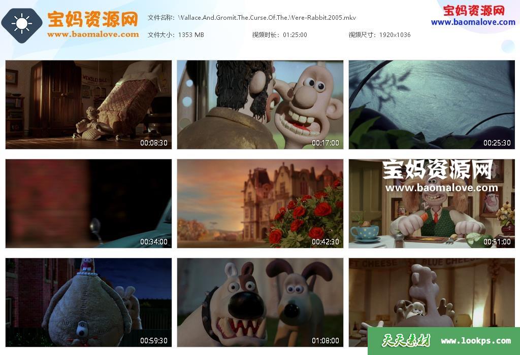 天天资源网收录的动画电影《超级无敌掌门狗:人兔的诅咒 Wallace & Gromit: The Curse of the Were-Rabbit》,英语发音,内置中英文字幕(可以下载后使用播放器设置字幕字体大小颜色或者关闭字幕);资源大小约1.32G,1080P高清MKV视频格式,可以在电视机或电脑、平板、IPAD、早教机、手机等各种智能设备播放,提供百度云网盘下载。