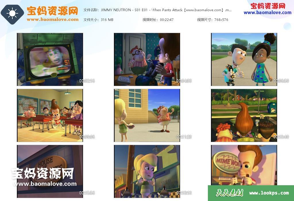 天天资源网收录的动画片《The Adventures of Jimmy Neutron, Boy Genius》天才小子吉米英文版 第一季,全部32集,英语发音,无字幕;资源总大小约6.03G,单集播放时长约11~22分钟,576P标清MP4视频格式,可以在电视机或电脑、平板、IPAD、早教机、手机等各种智能设备播放,提供百度云网盘下载。