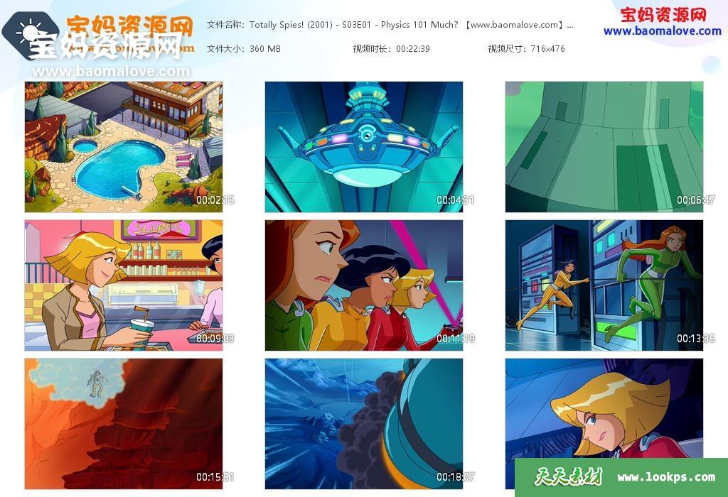 天天资源网收录的动画片《Totally Spies!》间谍少女组英文版 第三季,全部26集,英语发音,内置英文字幕(可以下载后使用播放器选择字幕或者关闭字幕);X265视频编码,资源总大小约9.16G,单集播放时长约22分钟,480P标清MKV视频格式,可以在电视机或电脑、平板、IPAD、早教机、手机等各种智能设备播放,提供百度云网盘下载。
