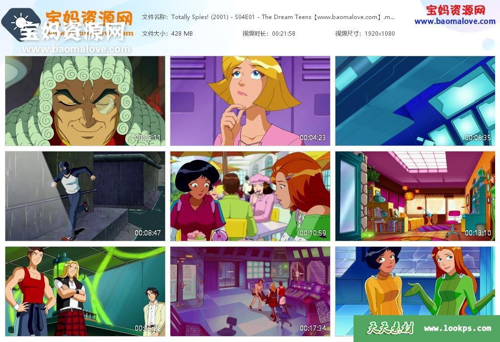 天天资源网收录的动画片《Totally Spies!》间谍少女组英文版 第四季,全部26集,英语发音,内置英文字幕(可以下载后使用播放器选择字幕或者关闭字幕);X265视频编码,资源总大小约10.8G,单集播放时长约22分钟,1080P高清MKV视频格式,可以在电视机或电脑、平板、IPAD、早教机、手机等各种智能设备播放,提供百度云网盘下载。