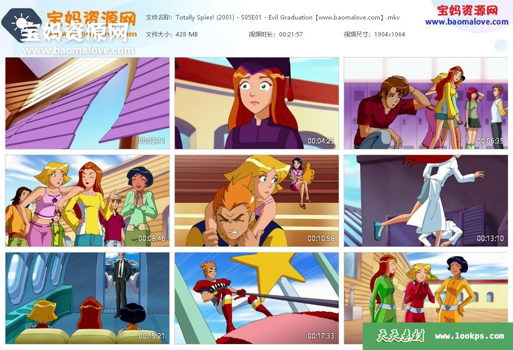 天天资源网收录的动画片《Totally Spies!》间谍少女组英文版 第五季,全部26集,英语发音,内置英文字幕(可以下载后使用播放器选择字幕或者关闭字幕);X265视频编码,资源总大小约10.8G,单集播放时长约22分钟,1080P高清MKV视频格式,可以在电视机或电脑、平板、IPAD、早教机、手机等各种智能设备播放,提供百度云网盘下载。