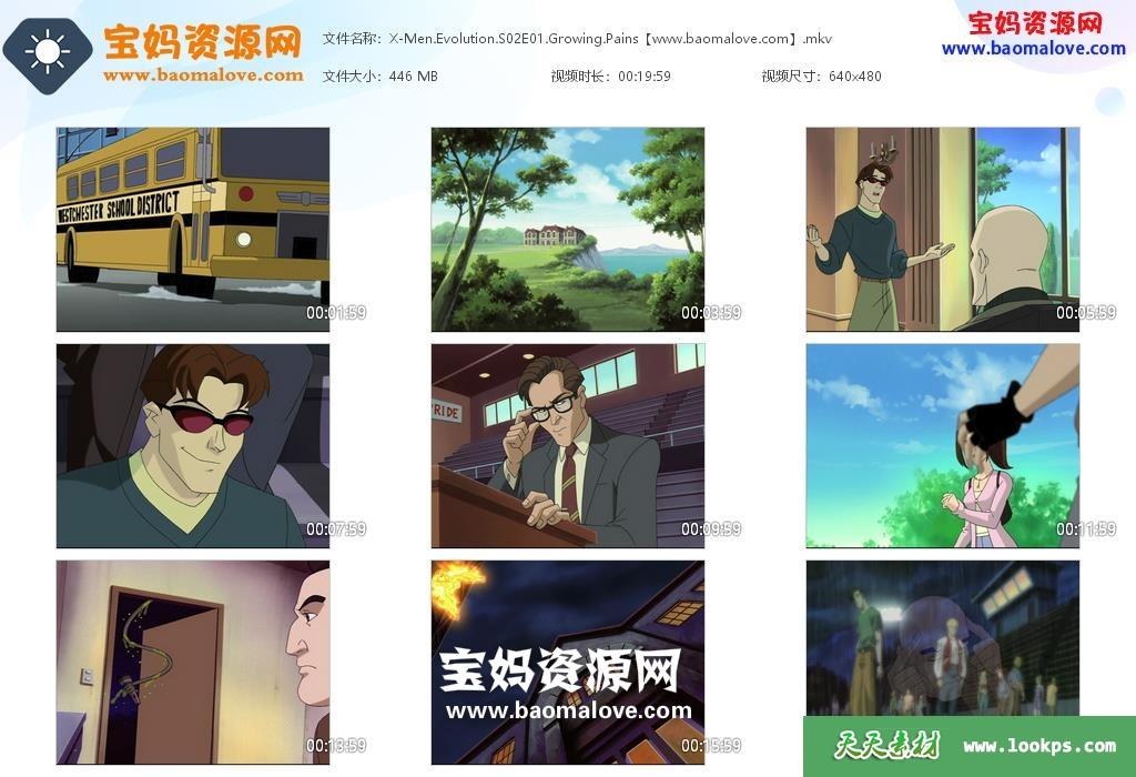 天天资源网收录的动画片《X-Men: Evolution》X战警:进化英文版 第二季,全部17集,英语发音,内置英文字幕(可以下载后使用播放器选择字幕或者关闭字幕);资源总大小约7.8G,单集播放时长约21分钟,480P标清MKV视频格式,可以在电视机或电脑、平板、IPAD、早教机、手机等各种智能设备播放,提供百度云网盘下载。