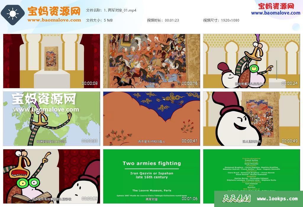 天天资源网收录的动画片《一分钟博物馆》1 minute in a museum中文版,全部78集,国语发音,中文字幕;资源总大小约376M,单集播放时长约1分钟,1080P高清MP4视频格式,可以在电视机或电脑、平板、IPAD、早教机、手机等各种设备播放,提供百度云网盘下载。