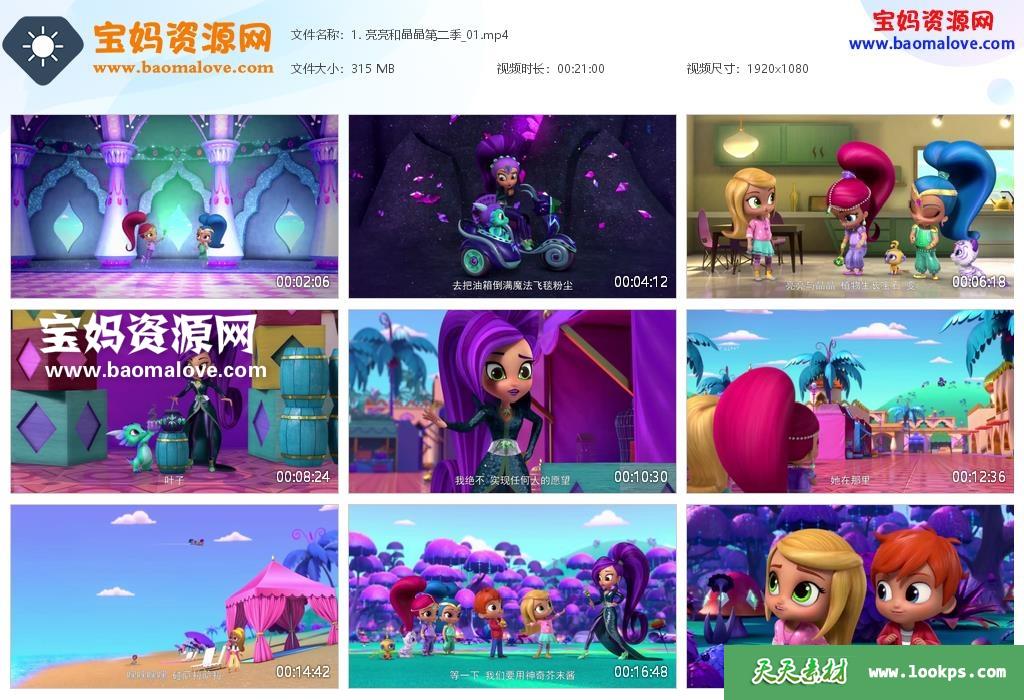 天天资源网收录的动画片《亮亮和晶晶》Shimmer and Shine中文版 第二季,全部20集,国语发音,中文字幕;资源总大小约7.04G,单集播放时长约22分钟,1080P高清MP4视频格式,可以在电视机或电脑、平板、IPAD、早教机、手机等各种智能设备播放,提供百度云网盘下载。