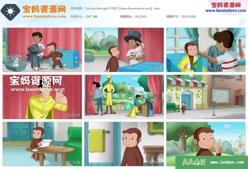天天资源网收录的动画片《Curious George》好奇的乔治英文版 第十一季,全部15集,英语发音,内置英文字幕(可以下载后使用播放器选择字幕或者切换关闭字幕);资源总大小约18.4G,单集播放时长约24分钟,1080P高清MKV视频格式,可以在电视机或电脑、平板、IPAD、早教机、手机等各种智能设备播放,提供百度云网盘下载。