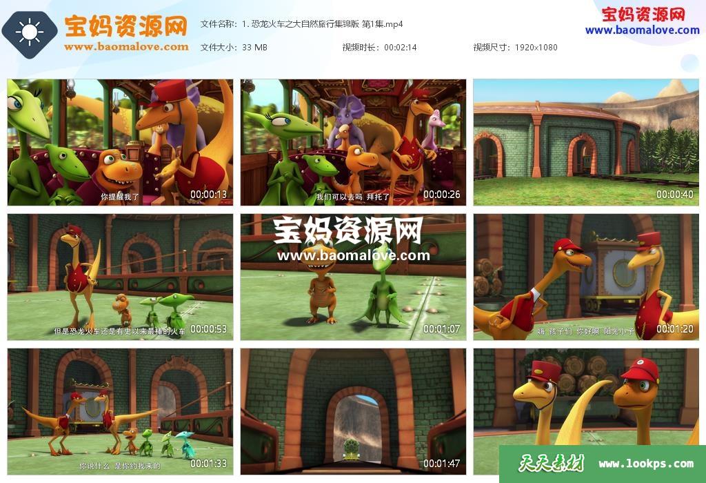 天天资源网收录的动画片《恐龙火车之大自然旅行集锦版》,全部104集,国语发音,中文字幕;资源总大小4.25G,单集播放时长约2~3分钟,1080P高清MP4视频格式,可以在电视机或电脑、平板、IPAD、早教机、手机等各种智能设备播放,提供百度云网盘下载。