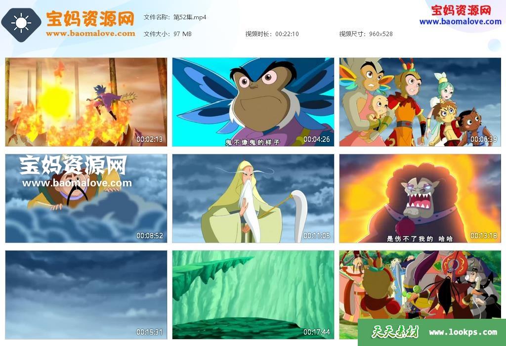天天资源网收录的动画片《美猴王》,全部52集,国语发音,中文字幕;资源总大小4.68G,单集播放时长约22分钟,528P标清MP4视频格式,可以在电视机或电脑、平板、IPAD、早教机、手机等各种智能设备播放,提供百度云网盘下载。