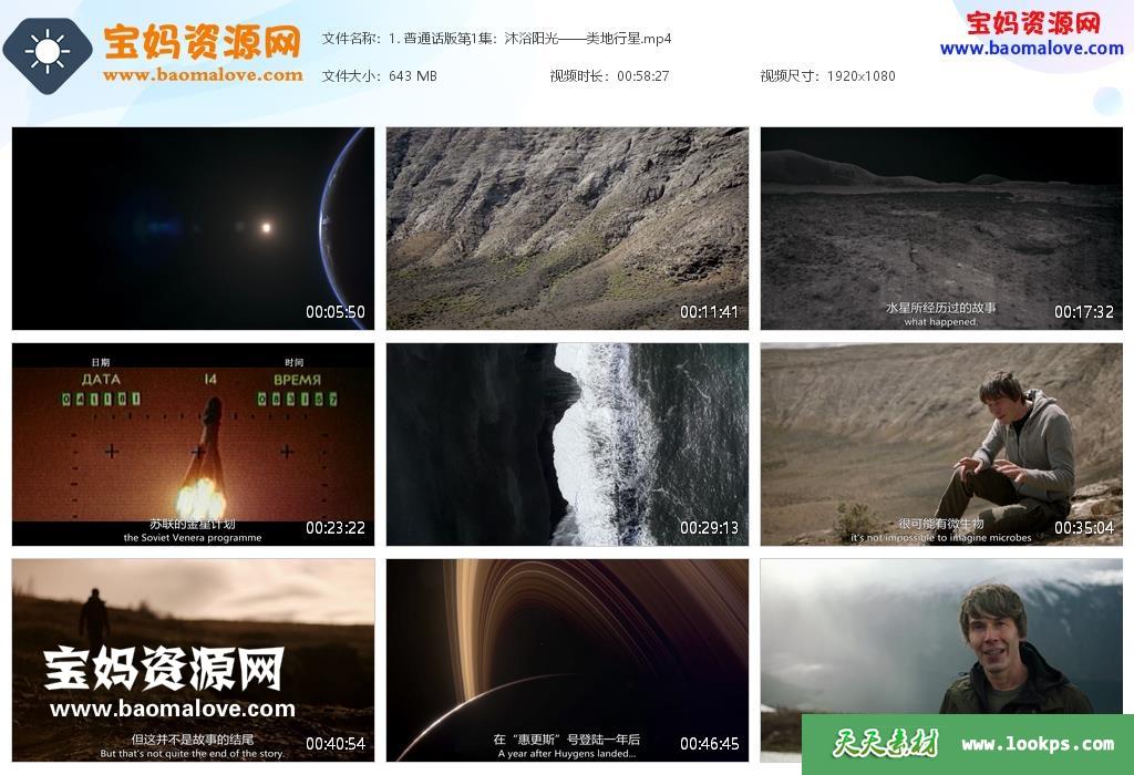 天天资源网收录的纪录片《行星 The Planets》,全部5集,国语发音,中英文字幕;资源总大小约2.57G,单集播放时长约58分钟,1080P高清MP4视频格式,可以在电视机或电脑、平板、IPAD、早教机、手机等各种智能设备播放,提供百度云网盘下载。