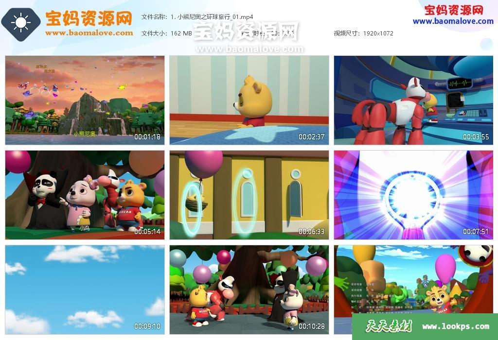 天天资源网收录的动画片《小熊尼奥之环球旅行》,全部26集,国语发音,中文字幕;资源总大小约3.88G,单集播放时长约13分钟,1080P高清MP4视频格式,可以在电视机或电脑、平板、IPAD、早教机、手机等各种智能设备播放,提供百度云网盘下载。