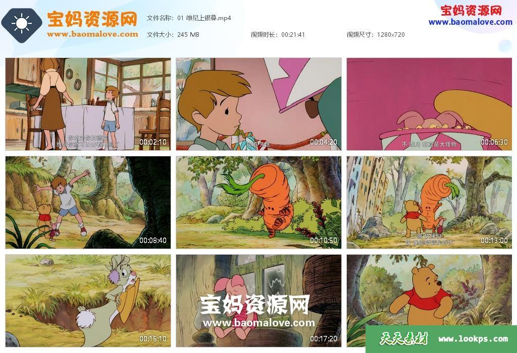 天天资源网收录的动画片《小熊维尼历险记》The New Adventures of Winnie the Pooh中文版 第一季,全部26集,国语发音,中文字幕;资源总大小约8.09G,单集播放时长约22分钟,720P高清MP4视频格式,可以在电视机或电脑、平板、IPAD、早教机、手机等各种智能设备播放,提供百度云网盘下载。