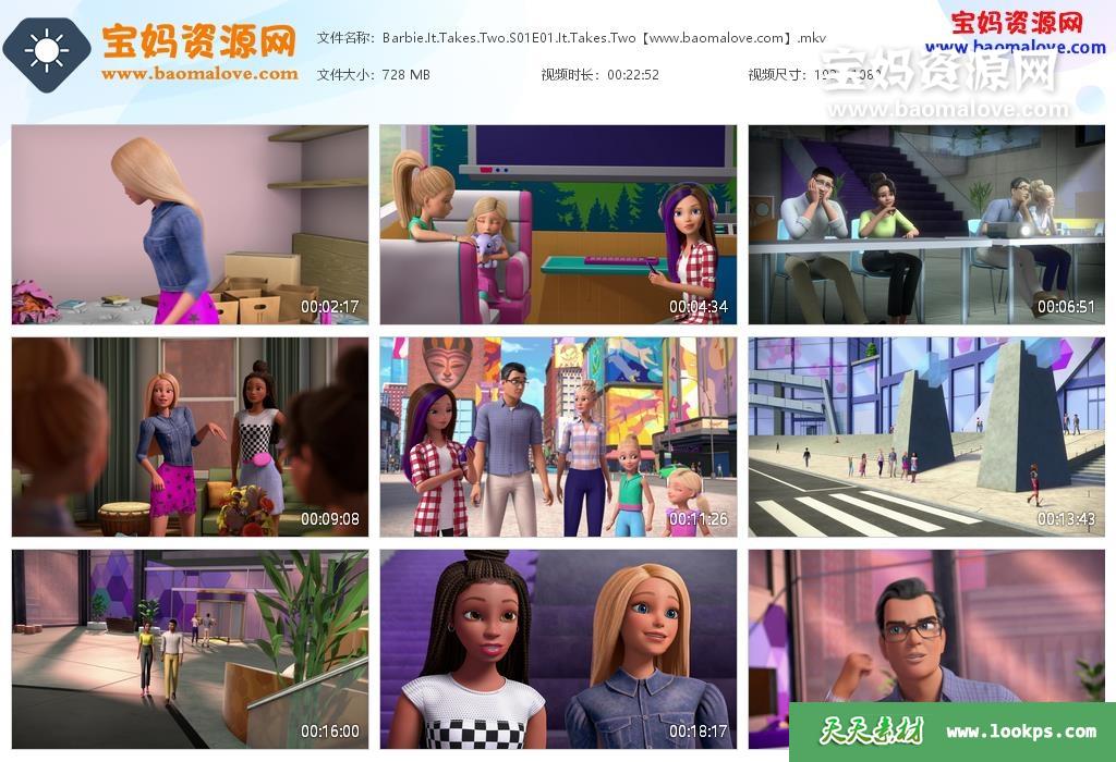 天天资源网收录的动画片《Barbie: It Takes Two》第一季,全部13集,英语发音,内置英文字幕(内置多国语言字幕,如简体中文,繁体中文,丹麦文,德文,法文,印地文,印度尼西亚文,韩文,泰文,越南文…可以下载后使用播放器选择字幕或者关闭切换字幕);资源总大小约8.58G,单集播放时长约23分钟,1080P高清MKV视频格式,可以在电视机或电脑、平板、IPAD、早教机、手机等各种智能设备播放,提供百度云网盘下载。