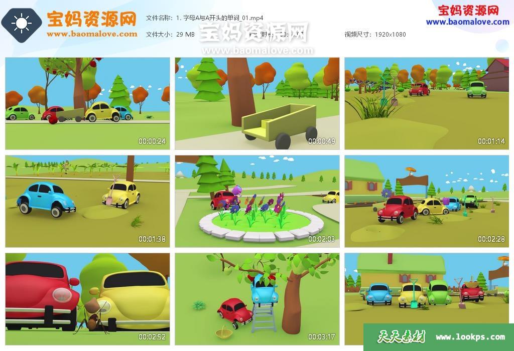 天天资源网收录的动画片《汽车小宝贝》,全部40集,国语发音,无字幕;资源总大小约929M,单集播放时长约4分钟,1080P高清MP4视频格式,可以在电视机或电脑、平板、IPAD、早教机、手机等各种智能设备播放,提供百度云网盘下载。