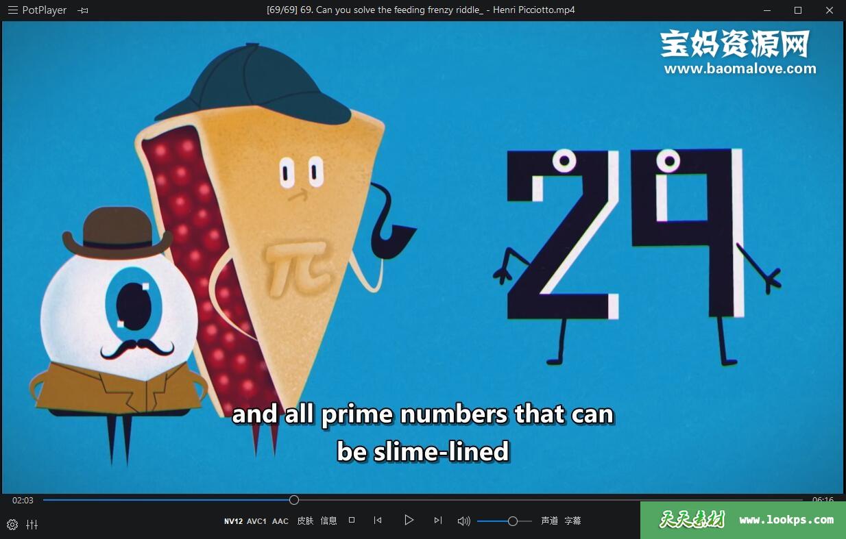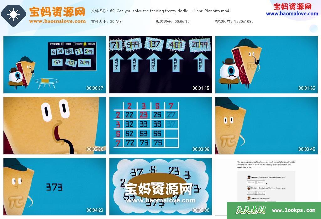 天天资源网收录的动画片《TED-Ed Can You Solve This Riddle?》,全部69集,英语发音,外挂英文字幕;资源总大小约2.48G,单集播放时长约5分钟,1080P高清MP4视频格式,可以在电视机或电脑、平板、IPAD、早教机、手机等各种设备播放,提供百度云网盘下载。
