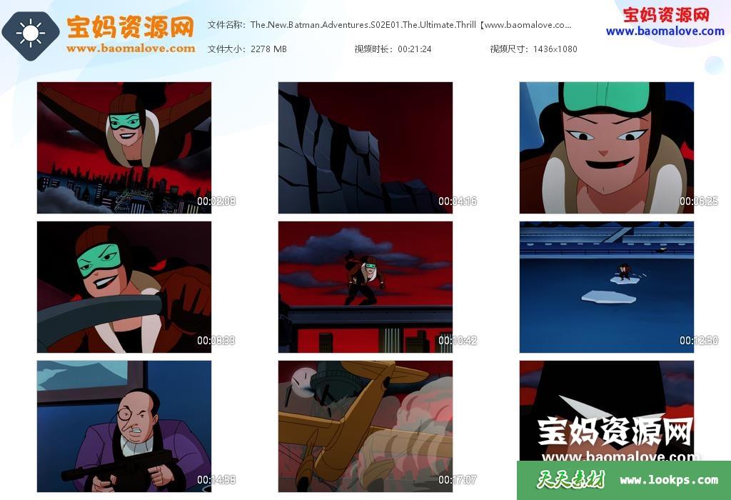 天天资源网收录的动画片《The New Batman Adventures》蝙蝠侠新冒险英文版 第二季,全部11集,英语发音,内置英文字幕(可以下载后使用播放器选择设置字幕或者关闭字幕);资源总大小23.2G,单集播放时长约21分钟,1080P高清MKV视频格式,可以在电视机或电脑、平板、IPAD、早教机、手机等各种智能设备播放,提供百度云网盘下载。
