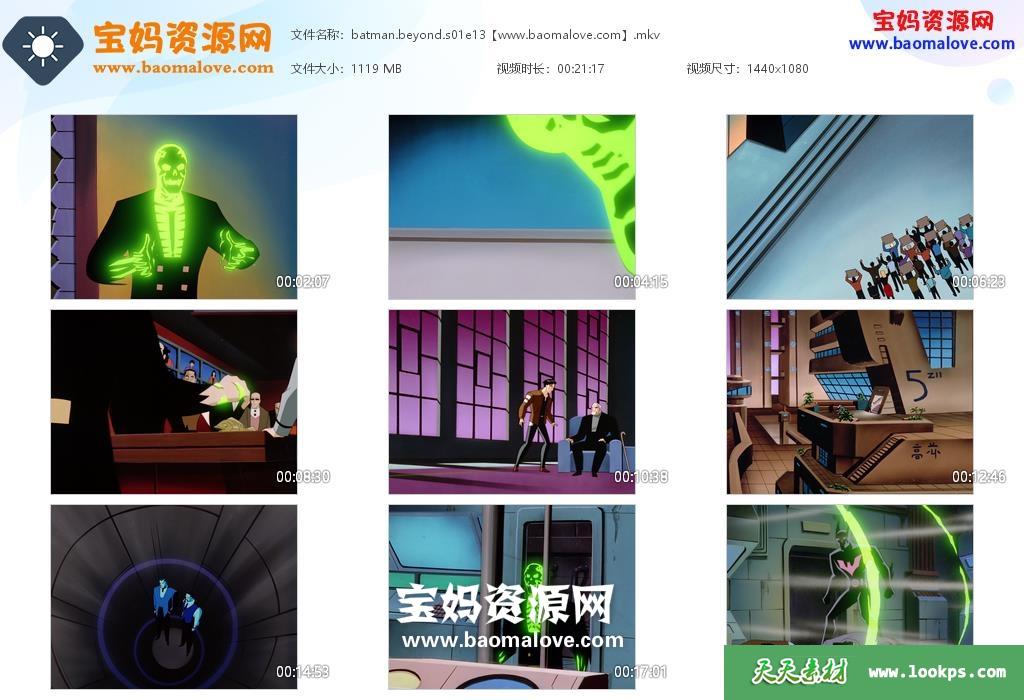 天天资源网收录的动画片《Batman Beyond》未来蝙蝠侠英文版 第一季,全部13集,英语发音,内置英文字幕(可以下载后使用播放器选择设置字幕或者关闭字幕);资源总大小14.2G,单集播放时长约21分钟,1080P高清MKV视频格式,可以在电视机或电脑、平板、IPAD、早教机、手机等各种智能设备播放,提供百度云网盘下载。