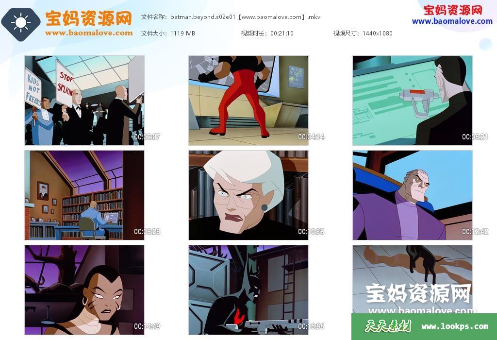 天天资源网收录的动画片《Batman Beyond》未来蝙蝠侠英文版 第二季,全部26集,英语发音,内置英文字幕(可以下载后使用播放器选择设置字幕或者关闭字幕);资源总大小28.41G,单集播放时长约21分钟,1080P高清MKV视频格式,可以在电视机或电脑、平板、IPAD、早教机、手机等各种智能设备播放,提供百度云网盘下载。