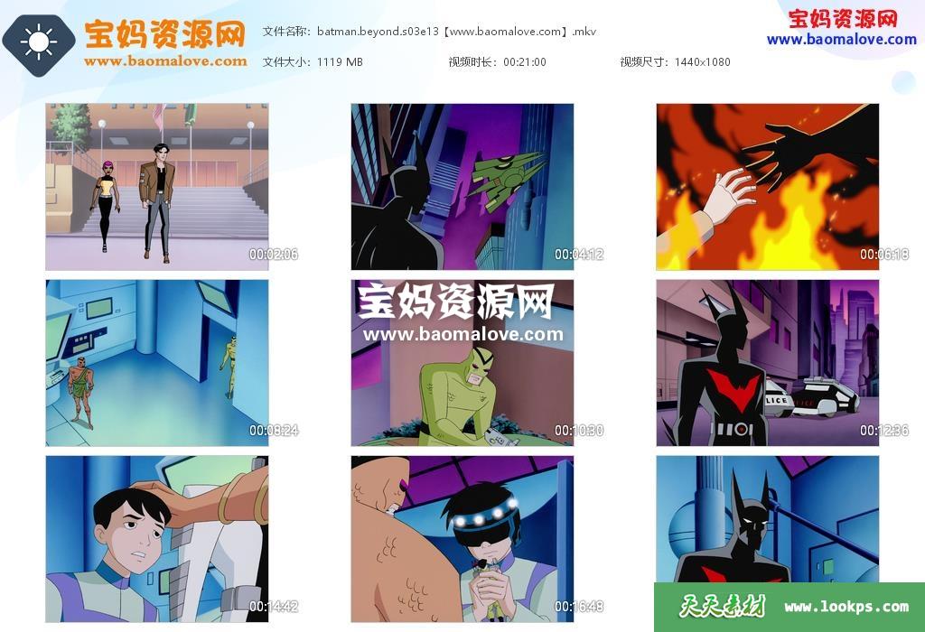 天天资源网收录的动画片《Batman Beyond》未来蝙蝠侠英文版 第三季,全部13集,英语发音,内置英文字幕(可以下载后使用播放器选择设置字幕或者关闭字幕);资源总大小14.21G,单集播放时长约21分钟,1080P高清MKV视频格式,可以在电视机或电脑、平板、IPAD、早教机、手机等各种智能设备播放,提供百度云网盘下载。