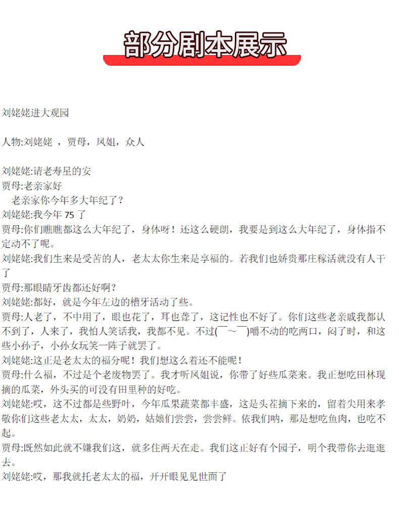 课本剧《刘姥姥进大观园》剧本背景视频LED音乐台词红楼梦舞台剧
