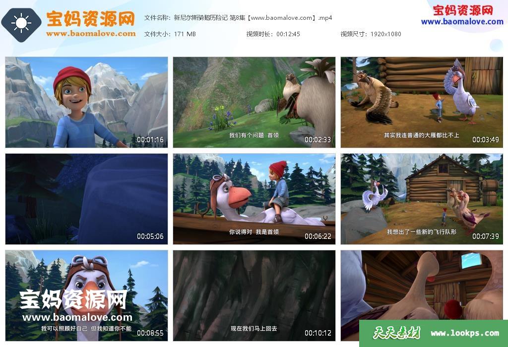 天天资源网收录的动画片《新尼尔斯骑鹅历险记》Nils Holgersson中文版 全部52集,国语发音,中文字幕;每集大小约150M,总大小9.23G,单集播放时长约12分钟,1080P高清MP4格式,可以在电视机或电脑、平板、IPAD、早教机、手机等各种设备播放,提供百度云网盘下载。