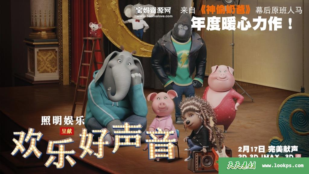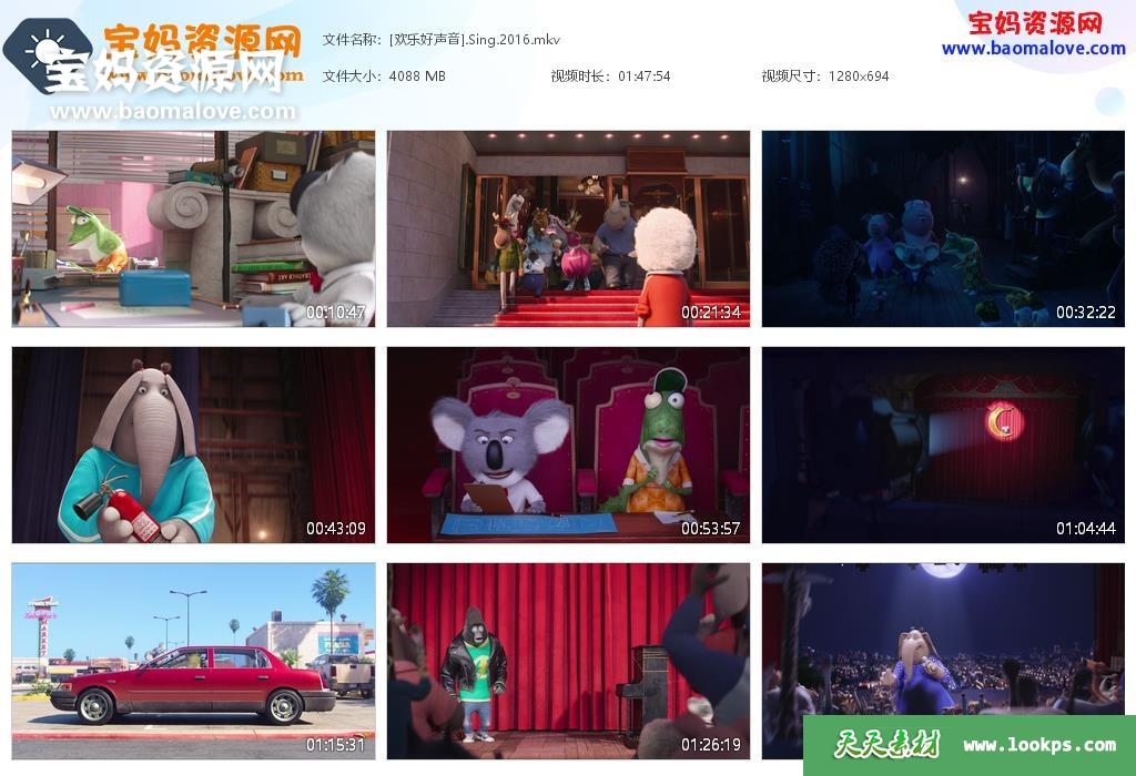 天天资源网收录的动画电影《欢乐好声音 Sing》,国粤台英四语发音,内置中英文字幕(可以下载后使用播放器选择设置字幕或者关闭字幕);资源大小约3.99G,720P高清MKV视频格式,可以在电视机或电脑、平板、IPAD、早教机、手机等各种设备播放,提供百度云网盘下载。